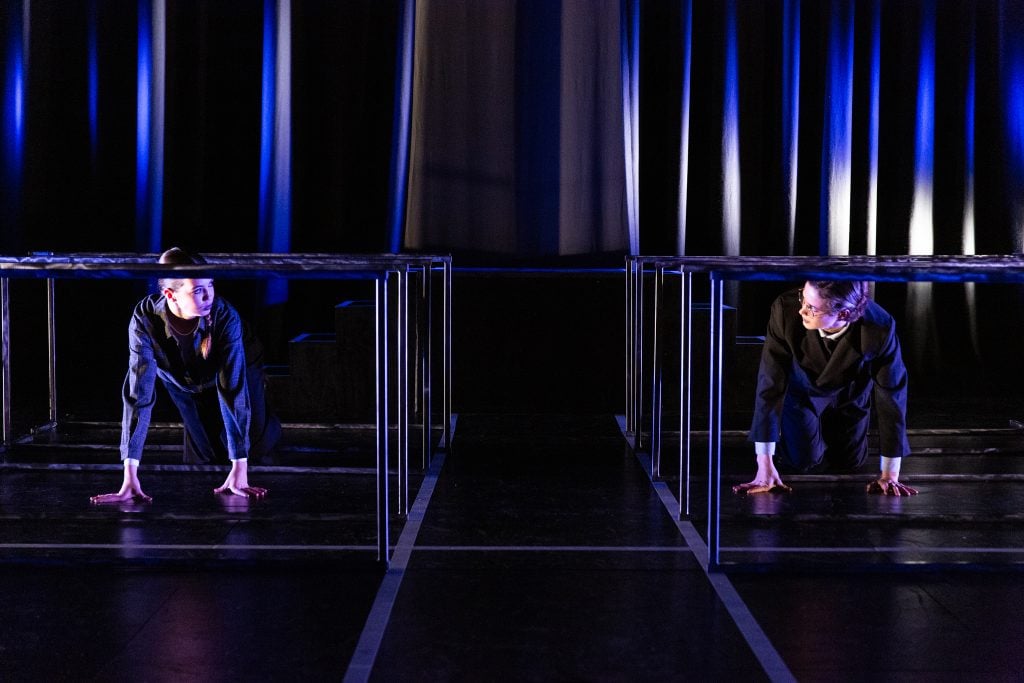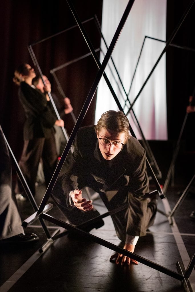 A minimalist but bold staging, dark and colourless, with simple door frames used to construct the changing scenes of the legal maze that Jospeh K moves through as his desperation to know the cause of his arrest mounts. Scenes of precise rhythmic and repetitious group movement create a claustrophobic atmosphere which heightened the increasing torment Joseph K was feeling.