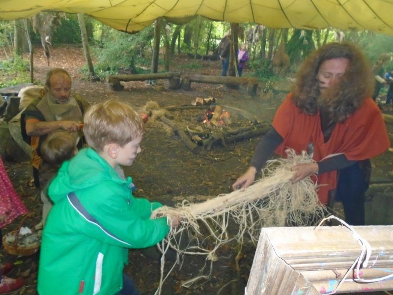 Relieved to find a new tribe willing to help them they escorted us back to their home in the woods where they showed us how to blow on the embers to relight the fire. They taught ancient skills of weapon making, shelter building, making paints and cooking and foraging. Having ground flour from seeds we all made Stone Age bread and cooked it in the embers on green 5ticks.