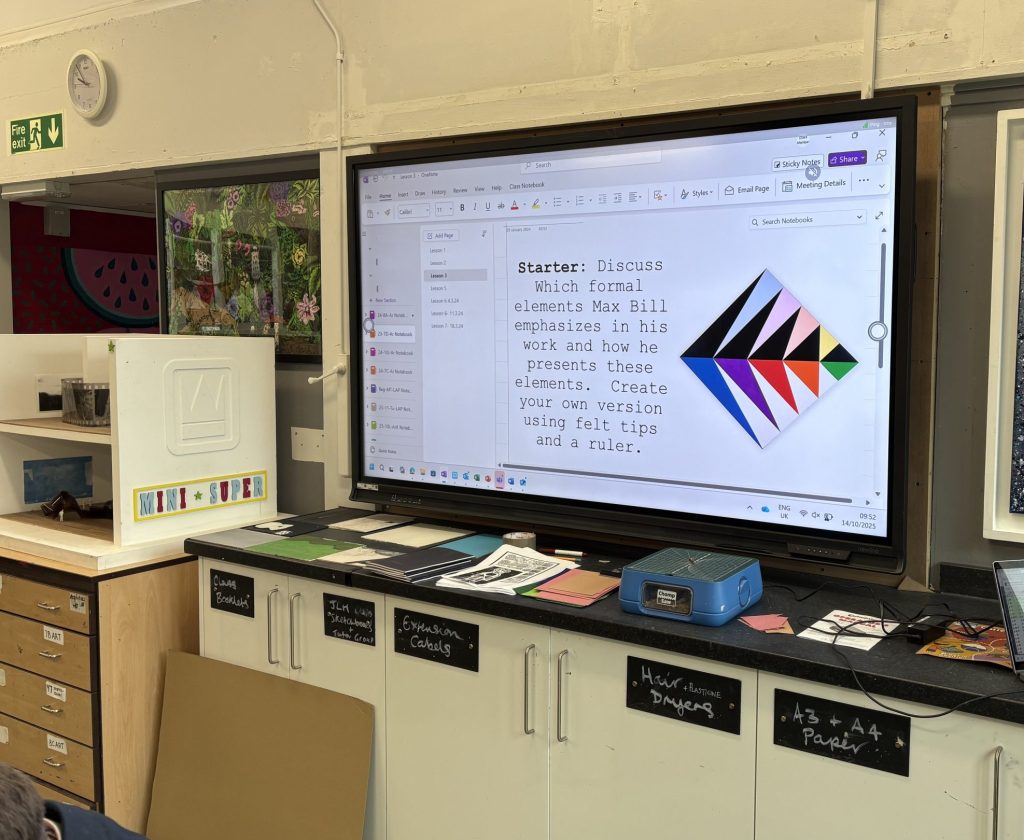 After creating and sharing their colourful 2D designs, students had the opportunity to create them in cardboard, using the chomp saw, a unique piece of apparatus in the Art department known to be a safe power tool for cutting cardboard with ease. Mrs Parker first held a demonstration, followed by the students using the saw independently – and so their designs began to spring to life. Colouring each piece of cardboard, there was also consideration of where colours should ‘sit’ on their individual designs, and Mrs Parker revisited the discussion students had recently had about the colour wheel, and how colours next to one another are complementary, while those opposite them on the wheel offer contrast.